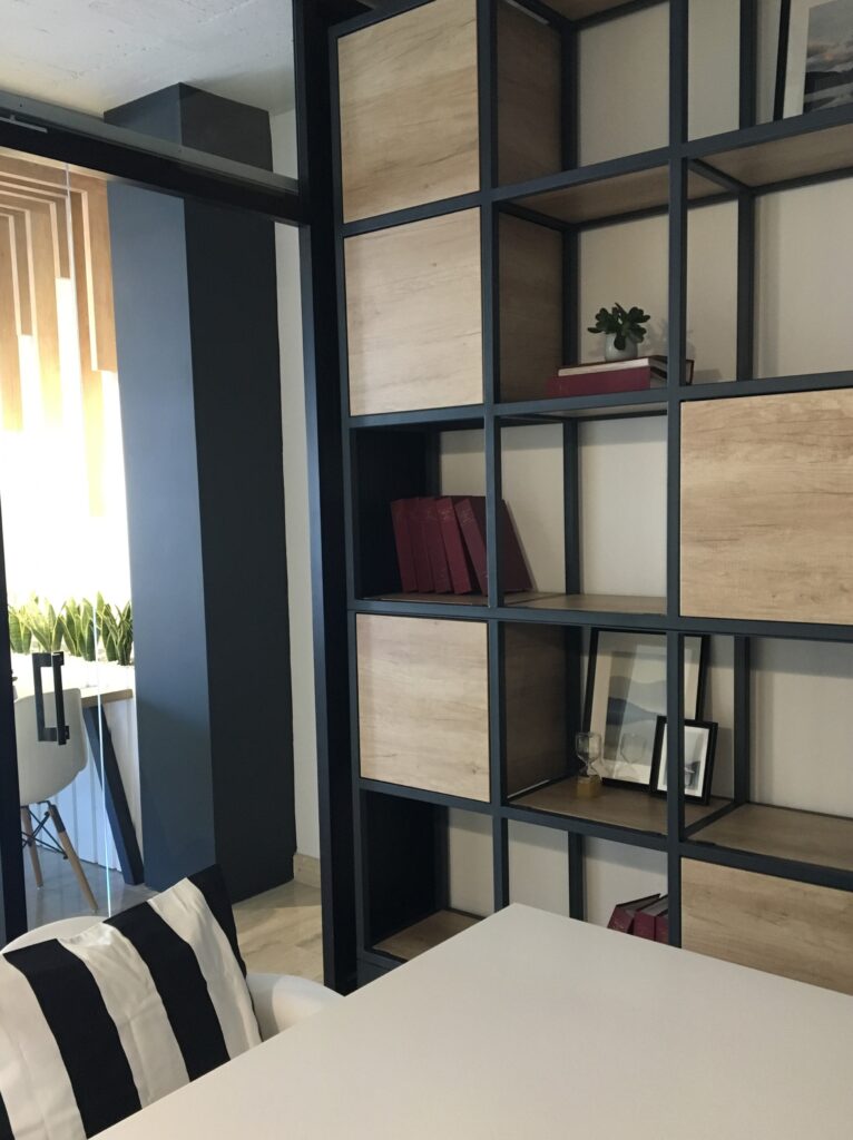 This was achieved through clever organization of the space provided, aesthetically pleasing partitions as well as the concealment of storage and functional elements.