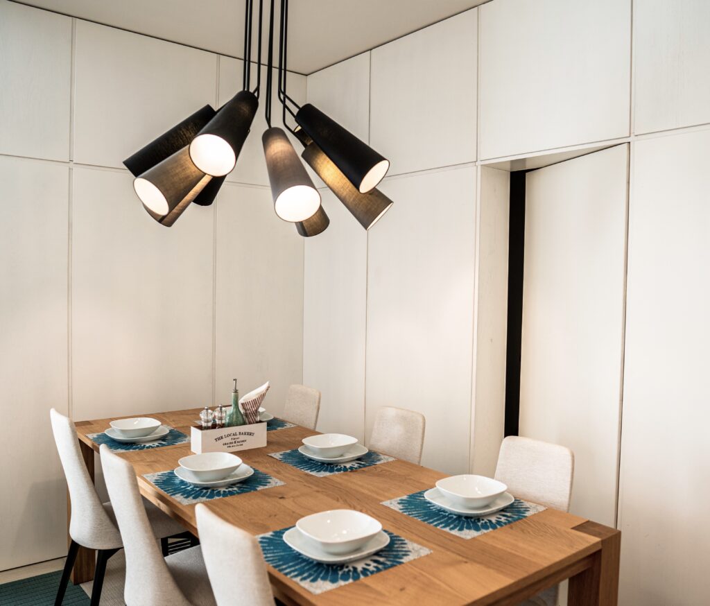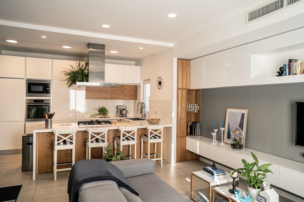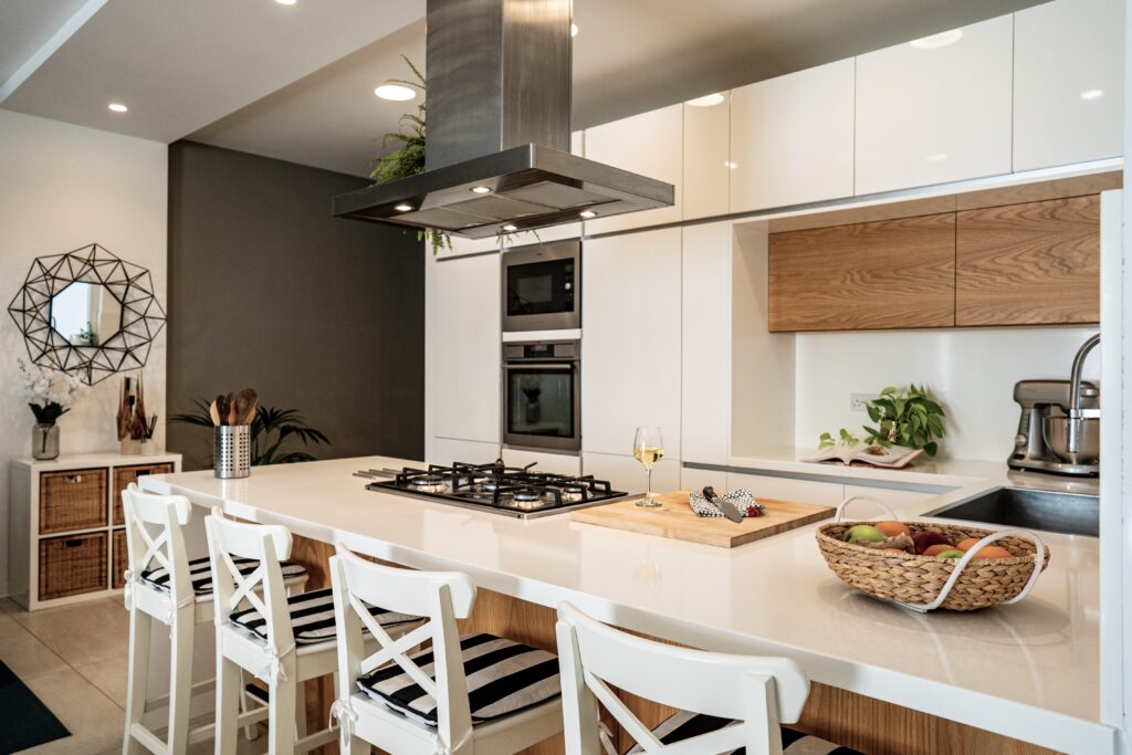 The open plan portrays all that the client is – a person who adores to cook and entertain. We therefore constructed a kitchen peninsula looking into the living room and dining area. Stools were incorporated for guests to sit down while the owner prepares the meal, ensuring that all are drawn into what is happening in the kitchen. The television within the living room was also mounted onto an adjustable bracket so it could face the kitchen while the owners are there.