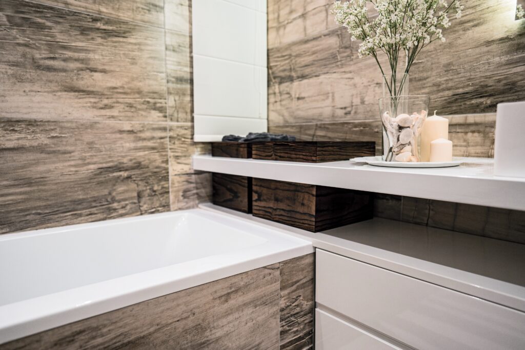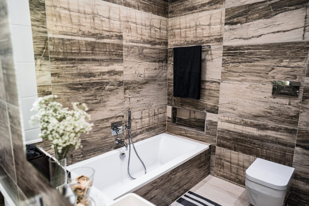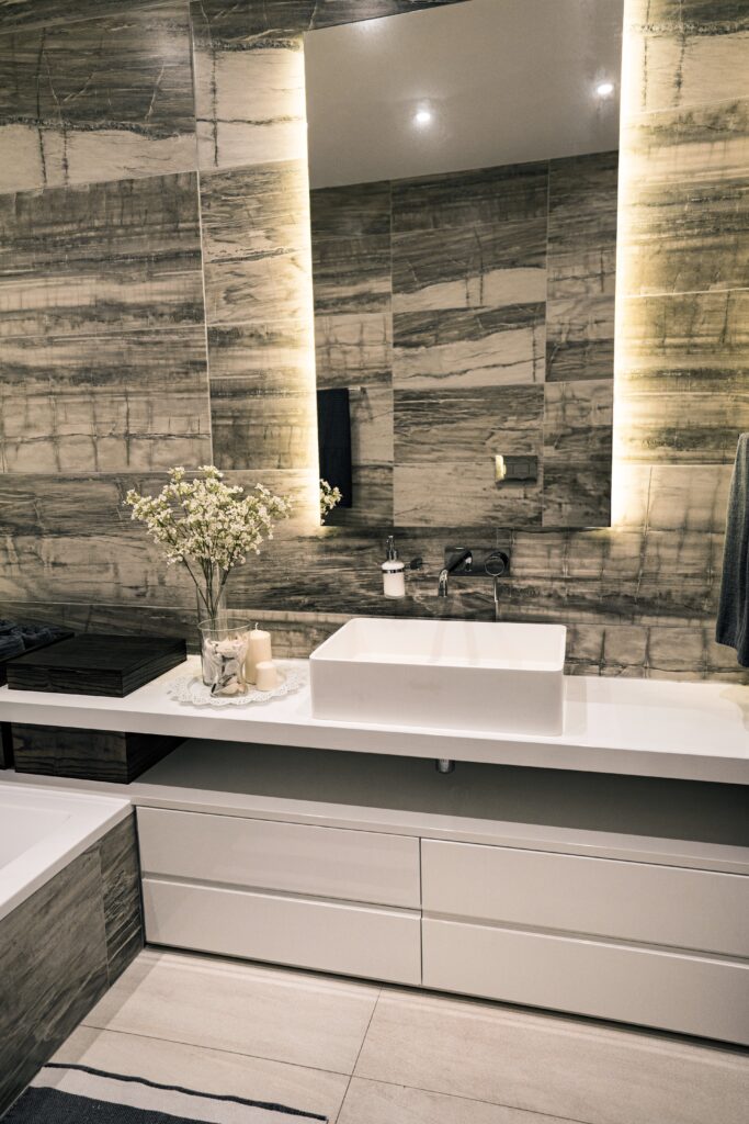 The client desired a ‘hotel-like’ atmosphere and this was achieved through the flooring which continues in all parts of the apartment including the bathrooms. Whilst retaining a neutral palette, a splash of colour was introduced within each room; for the bedroom the chosen colour was mustard and teal was used for the living room.
