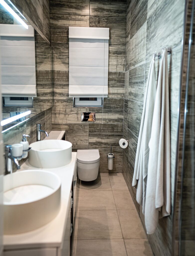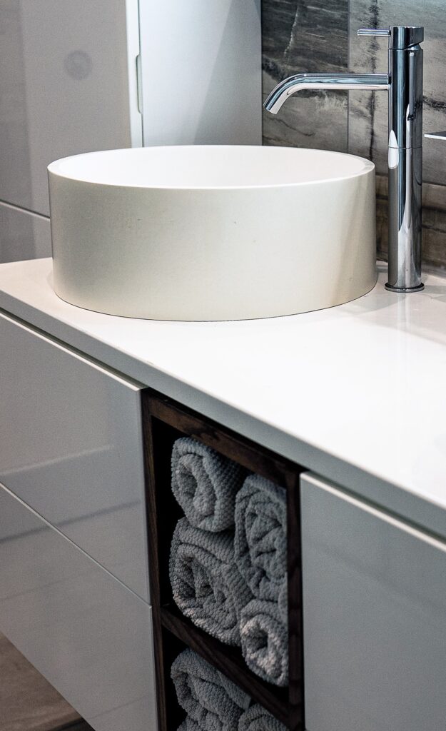 Examples as to how we used the space wisely include the customized laundry basket and towel shelving behind the bath in the main bedroom, as well as the custom cabinetry which provided extra storage.